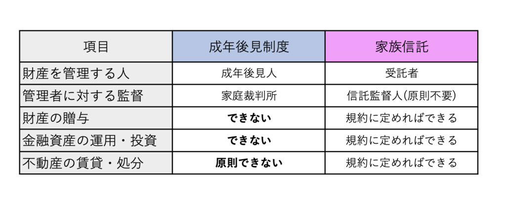 両制度の比較は家族信託における受託者の自由度が高く、委託者(認知症本人)の財産を契約に沿って管理することができます。